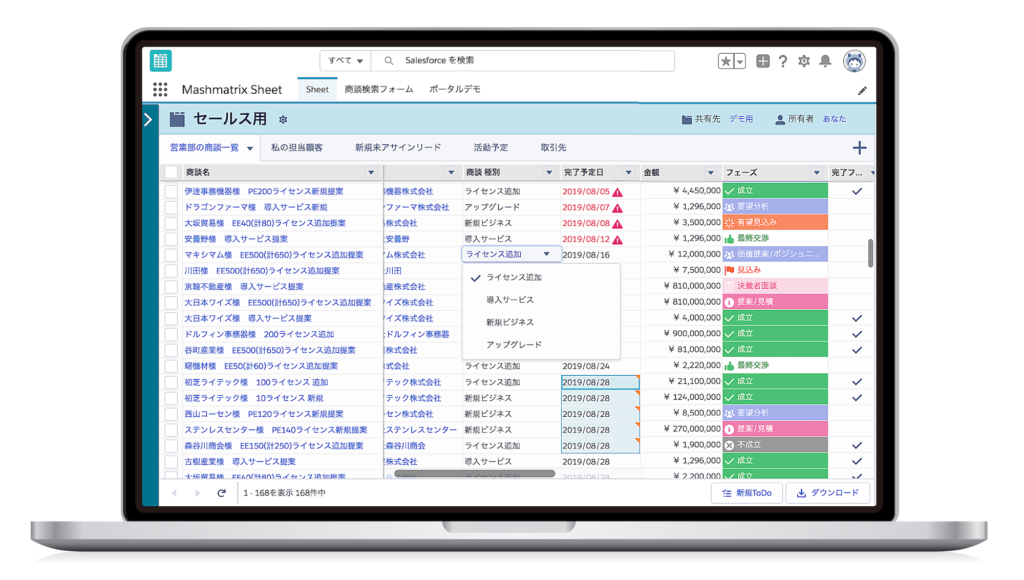 「Mashmatrix Sheet」は、SalesforceデータをExcelライクにラクラク閲覧編集できる一覧インターフェースです。検索や絞り込み・並べ替えといった操作はもちろん、一括編集やスクロールヘッダ固定など、Excelでお馴染みの操作感を保ったままSalesforceのデータを取り扱えます。