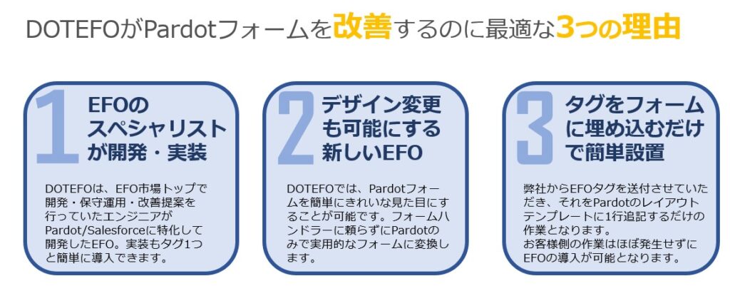 このような課題を解決すべく、この度リリースする「DOTEFO」は、Account Engagement(旧Pardot)で作成したフォームに、BtoCビジネスで活用されているEFOテクノロジーと弊社がSalesforceビジネスで蓄積したフォームの改善ノウハウをご提供し、お客様のフォームを最適化することでCVR(コンバージョンレート)の向上を可能にします。